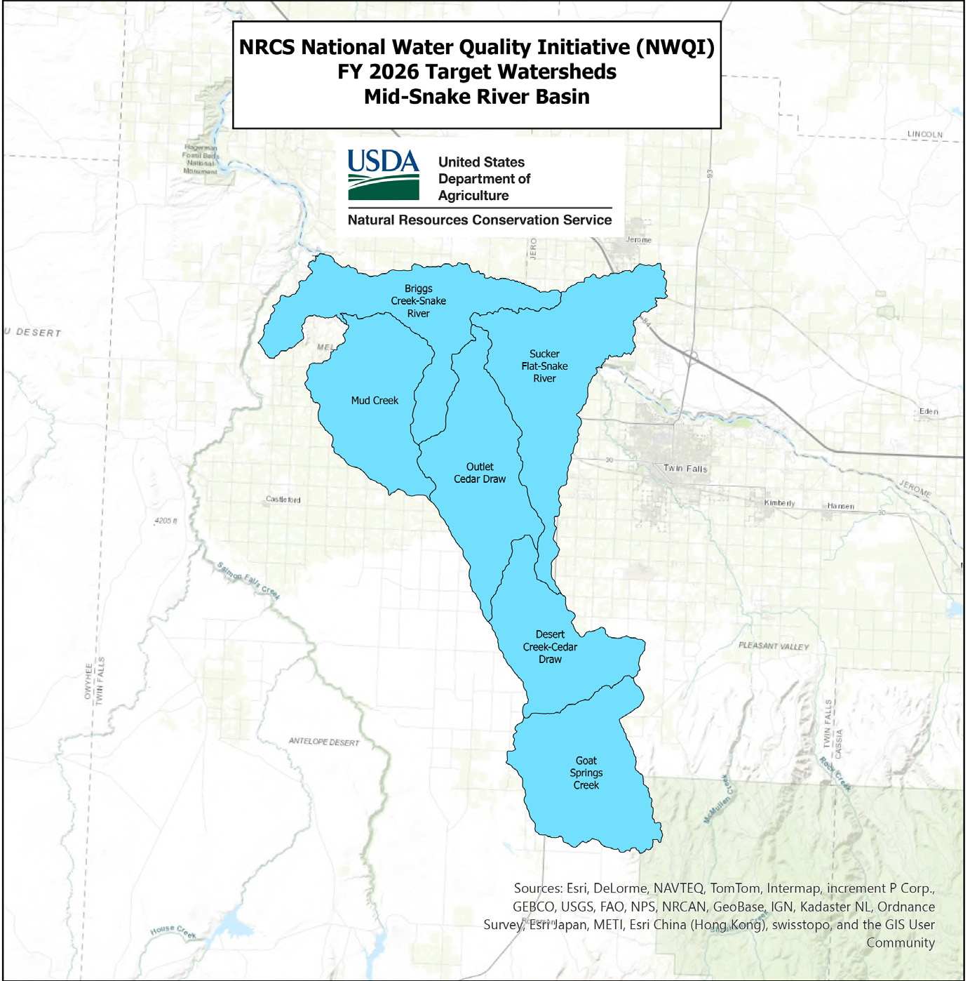 NRCS approved the Idaho Department of Environmental Quality’s (DEQ’s) application for the Mid-Snake NWQI in December 2025. The NWQI represents a joint effort between NRCS, local soil and water conservation districts, and community stakeholders. It also supports the DEQ’s Mid-Snake Total Maximum Daily Load revision by funding conservation practices that promote cleaner water and efficient use.
